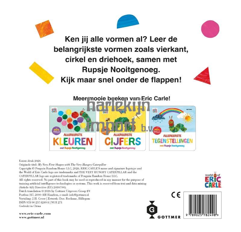 <p>In 'Allereerste vormen met Rupsje Nooitgenoeg' ontdekken jonge kinderen spelenderwijs de wereld van vormen. Rond, vierkant, driehoek en ovaal: samen met Rupsje Nooitgenoeg leren peuters vormen herkennen in hun eigen omgeving.<br><br>Dit kleurrijke kartonboek voor dreumesen en peuters vanaf 1 jaar combineert de iconische illustraties van Eric Carle met heldere, eenvoudige woorden. Het boek nodigt uit tot aanwijzen, benoemen en vergelijken en ondersteunt zo de taalontwikkeling en het herkennen van basisvormen.<br><br>'Allereerste vormen met Rupsje Nooitgenoeg' is een toegankelijk eerste leerboekje binnen de geliefde serie allereerste-boeken van Rupsje Nooitgenoeg. Een leuk eerste vormenboekje dat niet mag ontbreken in de boekenkast van jonge kinderen en leuk is als cadeau voor een eerste verjaardag of kraambezoek.<br><br>Ook verkrijgbaar: 'Allereerste tegenstellingen met Rupsje Nooitgenoeg', 'Allereerste kleuren met Rupsje Nooitgenoeg' en 'Allereerste cijfers met Rupsje Nooitgenoeg'.</p>