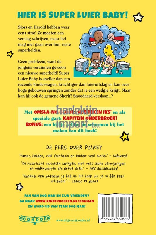 Deze kleine maar dappere held mag het opnemen tegen een gemene slechterik die op zijn superkrachten uit is. Is Super Luier Baby in staat om hem op tijd te stoppen, voordat hij de hele planeet overneemt…? Lees het in het nieuwste boek van Dav Pilkey, vertaald door Tjibbe Veldkamp.