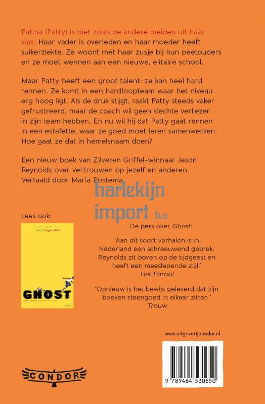 Patina, of Patty, is niet zoals de andere meiden uit haar klas. Haar vader is overleden en haar moeder heeft suikerziekte. Nu zijn zij en haar zusje ook nog een bij hun peetouders gaan wonen, en moet Patty wennen aan een nieuwe, elitaire school. Maar Patty heeft een talent: ze kan heel hard rennen. Ze komt in een hardloopteam waar het niveau erg hoog ligt. Als de druk stijgt, raakt Patty steeds vaker gefrustreerd, maar de coack wil geen slechte verliezer in zijn team hebben. En nu wil de coach dat Patty gaat rennen in een estafette, waar ze goed moet leren samenwerken. Hoe gaat ze dat in hemelsnaam doen? Het tweede deel in de serie van de Amerikaanse succesauteur Jason Reynolds.