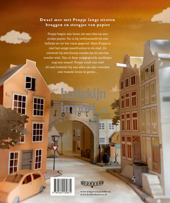 Propje begon zijn leven als een idee op een stukje papier. Nu is hij, verfrommeld tot een balletje, uit het raam gegooid en op straat beland. Maar Propje is niet het enige zwerfvuilnis in de stad. Zo ontmoet hij een karretje dat een wiel mist, een deksel zonder pan, en een ingedeukt conservenblikje. Zijn al deze weggegooide spulletjes niets meer waard? Propje vindt van niet! Al snel bedenkt hij van alles om zijn nieuwe vrienden een tweede leven te geven. Handgemaakte sets en prachtige fotografie van de jonge filmmaakster Marit Kok.