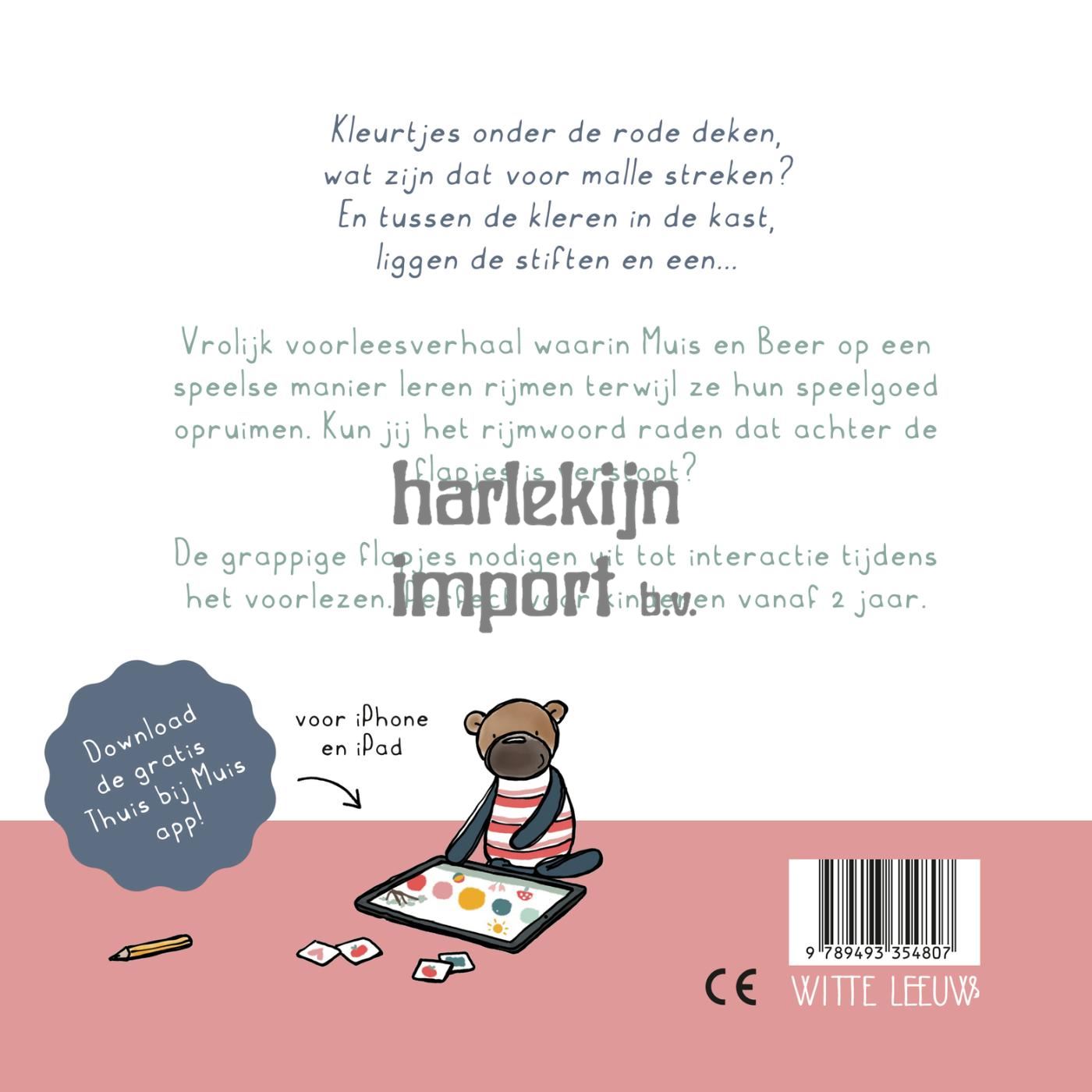 Zoek en rijm met Muis van Pauline Baartmans is een vrolijk voorleesverhaal op rijm met flapjes, waarin Muis en Beer op een speelse manier leren rijmen terwijl ze hun speelgoed opruimen. Kun jij het rijmwoord raden dat achter de flapjes is verstopt? De grappige flapjes nodigen uit tot interactie tijdens het voorlezen. Perfect voor peuters en kleuters (2+).  Met Muis is voorlezen een feestje! Dit boek sluit aan bij het rijmspel in de vernieuwde gratis app Thuis bij Muis met als doel: spelenderwijs leren rijmen.