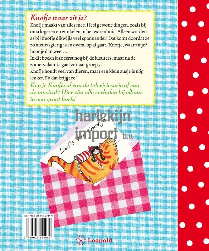 Knofje, waar zit je? Knofje maakt van alles mee. Heel gewone dingen, zoals bij oma logeren en winkelen in het warenhuis. Alleen worden ze bij Knofje dikwijls veel spannender! Dat komt doordat ze zo nieuwsgierig is en overal op af gaat. 'Knofje, waar zit je?' hoor je dan weer… In dit boek zit ze eerst nog bij de kleuters, maar na de zomervakantie gaat ze naar groep 3. Knofje houdt veel van dieren, maar een klein zusje is nóg leuker. En dat krijgt ze! Ken je Knofje al van de televisieserie of van de musical? Hier zijn alle verhalen bij elkaar in een groot boek!