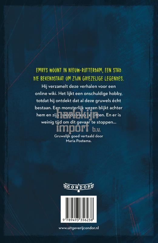 Emrys woont in Nieuw-Rotterdam, een stad die bekendstaat om zijn griezelige legendes. Hij verzamelt deze verhalen voor een online wiki. Het lijkt een onschuldige hobby, totdat hij ontdekt dat al deze gruwels écht bestaan. Een monsterlijk figuur blijkt achter hem en zijn vrienden aan te zitten. En er is weinig tijd om dit gevaar te stoppen… Een ultraspannend hoofdverhaal, afgewisseld met korte, ijzingwekkende verhalen uit Emrys’ wiki-verzameling. Vertaald door Maria Postema en gruwelijk goed geïllustreerd door Sophie Pluim.