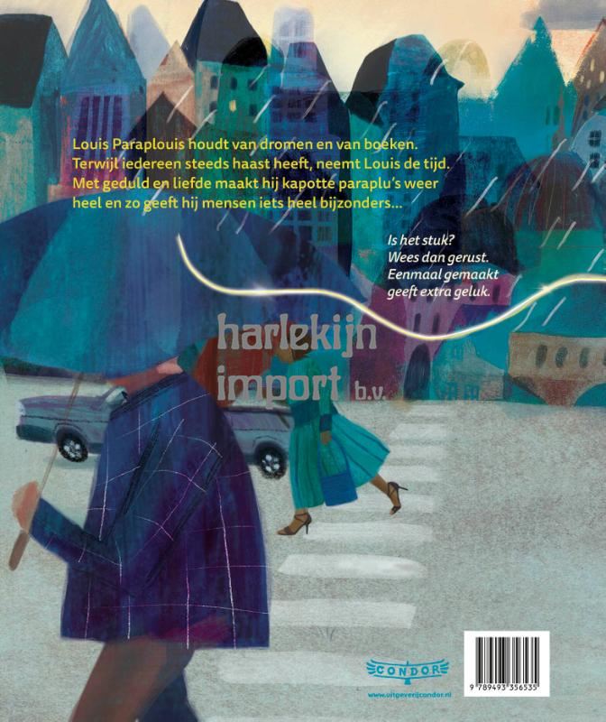 Kapotte paraplu? Geen zorgen! Louis Paraplouis komt te hulp met zijn magische gouddraad en tovert regenachtige dagen om in kleine geluksmomenten. Louis staat op de hoek van een drukke straat met zijn karretje vol gereedschap. Hij helpt een verregende sjieke dame, een chagrijnige jongeman en een meisje met een lieveheerskikkerplu. Hij biedt niet alleen bescherming, maar ook een vleugje kleur en rust in de grijze stad. Een spetterend prentenboekendebuut van woordkunstenaar Tieka Masfar en illustrator Marianne van der Walle.