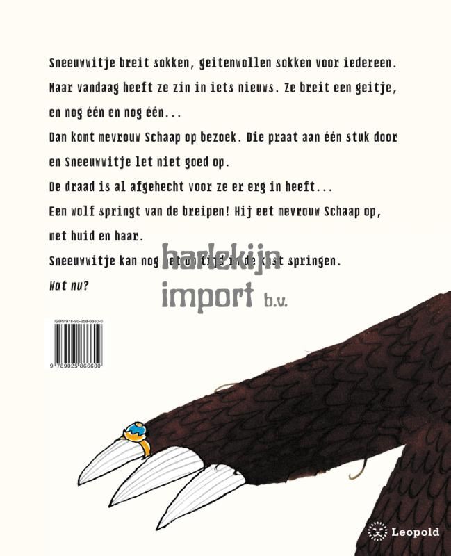 Sneeuwwitje breit sokken, geitenwollen sokken voor iedereen. Maar vandaag heeft ze zin in iets nieuws. Ze breit een geitje, en nog één en nog één Dan komt mevrouw Schaap op bezoek. Die praat aan één stuk door en Sneeuwwitje let niet goed op. De draad is al afgehecht voor ze er erg in heeft Een wolf springt van de breipen! Hij eet mevrouw Schaap op, met huid en haar. Sneeuwwitje kan nog net op tijd in de kast springen. Wat nu?