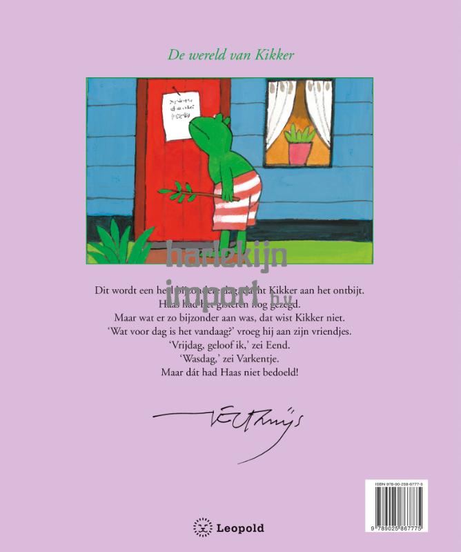 Dit wordt een heel bijzondere dag, dacht Kikker aan het ontbijt. Haas had het gisteren nog gezegd. Maar wat er zo bijzonder aan was, dat wist Kikker niet. 'Wat voor dag is het vandaag?' vroeg hij aan zijn vriendjes. 'Vrijdag, geloof ik,' zei Eend. 'Wasdag,' zei Varkentje. Maar dát had Haas niet bedoeld!