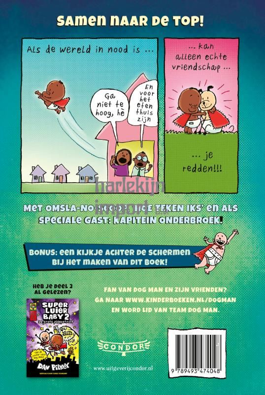 Sjors en Harold hebben weer eens straf op school. Ze moeten een verslag schrijven over ‘goed burgerschap’. Hier mogen hun vaste verzonnen superhelden helaas niet in voorkomen. Maar dit is geen probleem voor de vrienden, want ze verzinnen gewoon een nieuwe superheld: Super Luier Baby! Deze kleine maar dappere held mag het opnemen tegen een gemene slechterik die op zijn superkrachten uit is. Is Super Luier Baby in staat om hem op tijd te stoppen, voordat hij de hele planeet overneemt…? Lees het allemaal in dit knallend kleurrijke, nieuwste boek van Dav Pilkey, vertaald door Tjibbe Veldkamp.