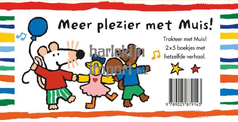 In deze set zitten 5 exemplaren van twee vrolijke Muisboekjes: Muis maakt muziek en Muis wil spelen. (10 boekjes in totaal om uit te delen)