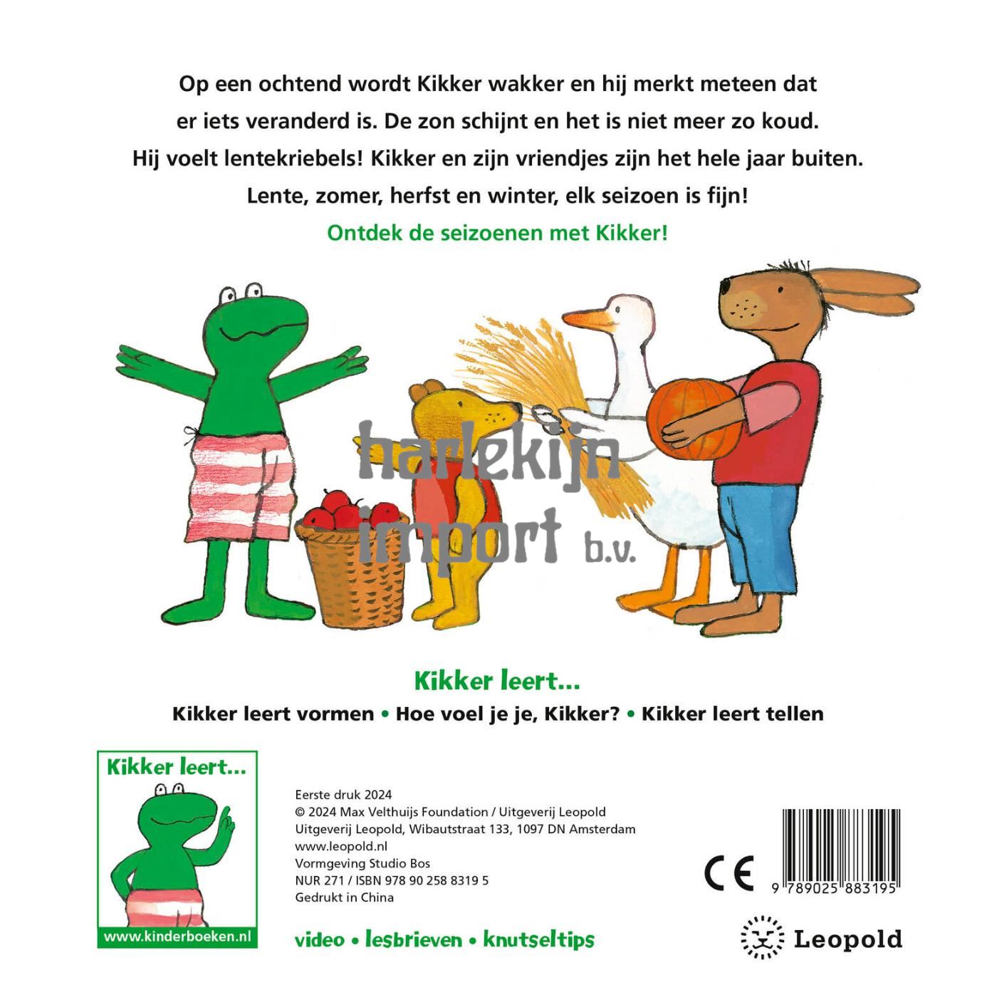 Op een ochtend wordt Kikker wakker en hij merkt meteen dat er iets veranderd is. De zon schijnt en het is niet meer zo koud. Hij voelt lentekriebels! Kikker en zijn vriendjes zijn het hele jaar buiten.Lente, zomer, herfst en winter, elk seizoen is fijn! Ontdek de seizoenen met Kikker! Ook in de serie Kikker leert: Kikker leert vormen • Hoe voel je je, Kikker? • Kikker leert tellen