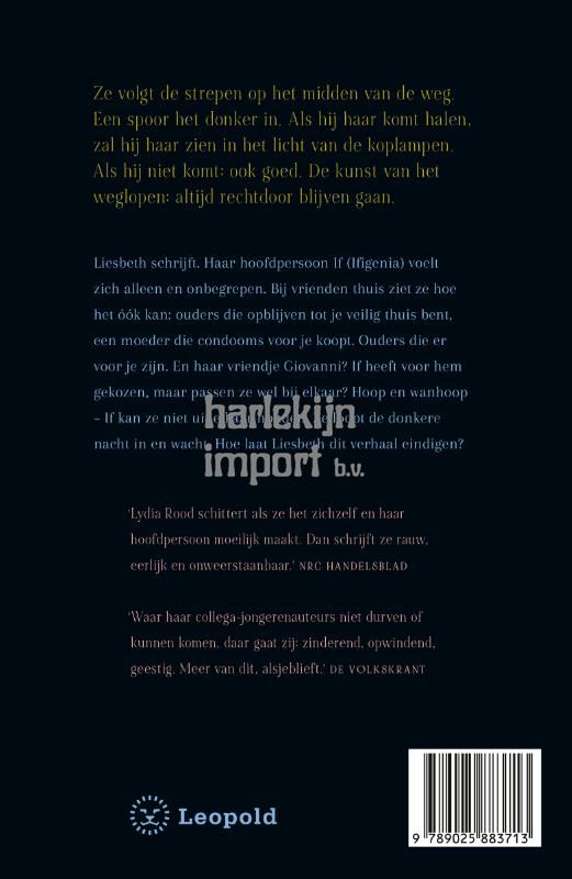 Liesbeth schrijft. Haar hoofdpersoon If (Ifigenia) voelt zich alleen en onbegrepen. Bij vrienden thuis ziet ze hoe het óók kan: ouders die opblijven tot je veilig thuis bent, een moeder die condooms voor je koopt. Ouders die er voor je zijn. En haar vriendje Giovanni? If heeft voor hem gekozen, maar passen ze wel bij elkaar? Hoop en wanhoop – If kan ze niet uit elkaar houden. Ze loopt de donkere nacht in en wacht. Hoe laat Liesbeth dit verhaal eindigen?