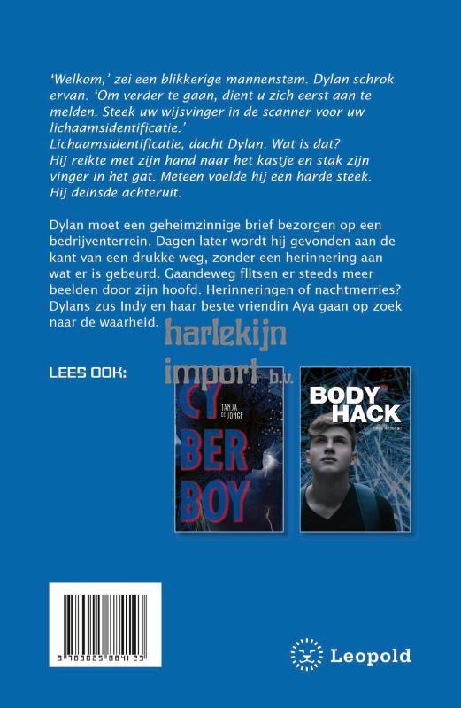 ‘Welkom,’ zei een blikkerige mannenstem. Dylan schrok ervan. ‘Om verder te gaan, dient u zich eerst aan te melden. Steek uw wijsvinger in de scanner voor uw lichaamsidentificatie.’ Lichaamsidentificatie, dacht Dylan. Wat is dat? Hij reikte met zijn hand naar het kastje en stak zijn vinger in het gat. Meteen voelde hij een harde steek. Hij deinsde achteruit.