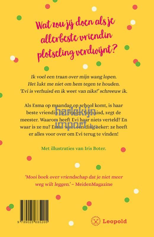 Ik voel een traan over mijn wang lopen. Het lukt me niet om hem tegen te houden. ‘Esma, wat is er?’ vraagt Chiara. Ik veeg mijn tranen weg en wil wegfietsen, maar Chiara pakt me bij mijn arm. ‘Evi is verhuisd en ik weet van niks!’ schreeuw ik. Als Esma op maandag op school komt, is haar beste vriendin Evi er niet. Verhuisd, zegt de meester. Waarom heeft Evi haar niets verteld? En waar is ze nu? Met de hulp van een meisje uit de klas doet Esma er alles aan om haar te vinden.