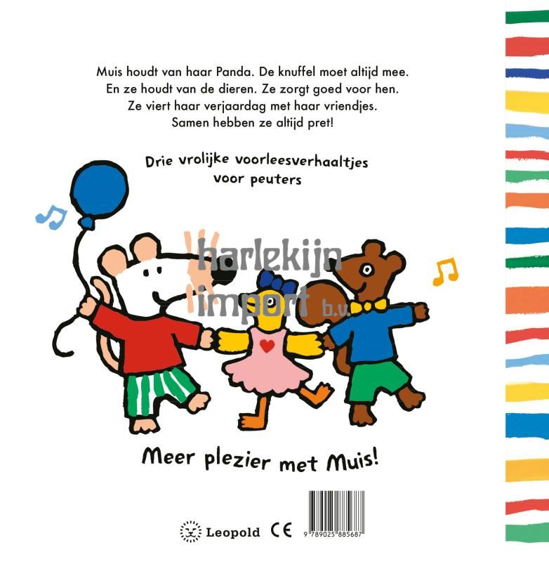 Muis houdt van haar Panda. De knuffel moet altijd mee.En ze houdt van de dieren. Ze zorgt goed voor hen.Ze viert haar verjaardag met haar vriendjes.Samen hebben ze altijd pret! Drie vrolijke voorleesverhaaltjes voor peuters.