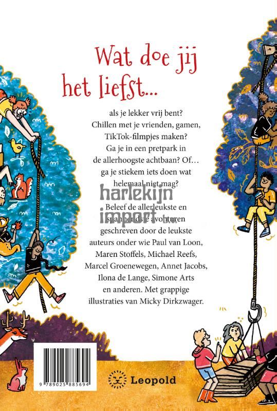 Wat doe jij het liefst als je lekker vrij bent? Chillen met je vrienden, gamen, TikTok-filmpjes maken, naar de kermis, spetteren in een tropisch zwemparadijs of ga je stiekem iets doen wat helemaal niet mag? Beleef de allerleukste en spannendste avonturen geschreven door de leukste auteurs onder wie Paul van Loon, Maren Stoffels, Michael Reefs, Marcel Groenewegen, Annet Jacobs en Ilona de Lange. Met humoristische illustraties van Micky Dirkzwager