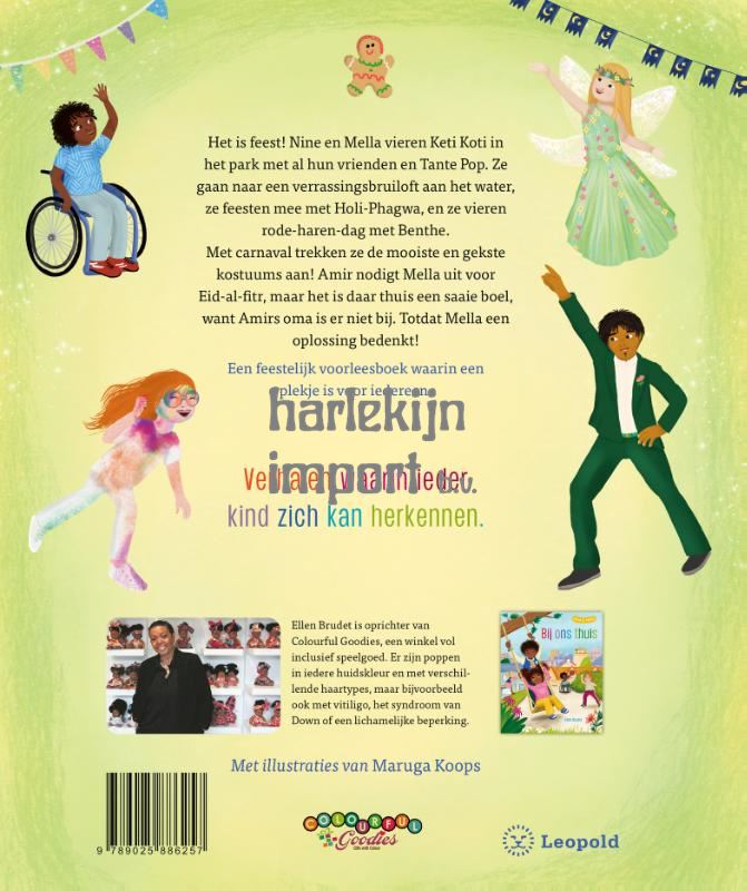 Als Lin de ringen voor het trouwfeest van haar vaders kwijt is, helpt Nine natuurlijk zoeken. Met carnaval laat Romy de buurvrouw schrikken met haar prachtige leeuwenkop. Amir, Mella en Benthe bakken samen de lekkerste koekjes voor Eid-al-Fitr. Benthe noemt dat het Suikerfeest. Als Nine en Mella hun hondje Dyna met dierendag in het zonnetje zetten, gooit een enorme hond bijna roet in het eten. En op Keti Koti organiseert Tante Pop een onvergetelijk feest in het park. Iedereen magmeedoen! Vrolijke, herkenbare verhalen over de verschillende feesten die door het jaar heen worden gevierd, van het Suikerfeest tot Dierendag. ‘Een inclusiever voorleesboek dan dit zul je nergens vinden. Af en toe pinkte ik een traantje van ontroering weg, zo mooi, zo positief, dat gun je iedere kleuter.’ GOODREADS
