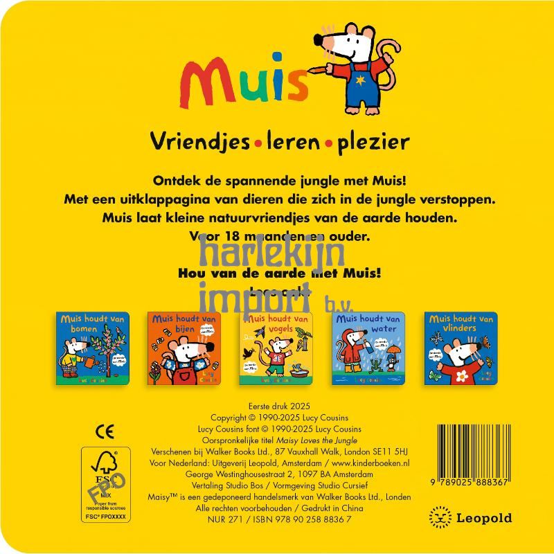 In het kartonboek (inclusief uitklapper) Muis houdt van de jungle neemt Lucy Cousins, die al 35 jaar schrijft over Muis, peuters mee op ontdekking door de natuur. De helft van alle planten op de wereld groeit namelijk in de jungle! Zo dicht op elkaar dat je er moeilijk doorheen komt. Dus Muis vaart met de boot over de rivier. Overal zijn dieren, van grote tot kleine kriebelbeestjes, verstopt in het groen. En al die dieren maken heel veel geluid! Een heerlijk zoekboek!
