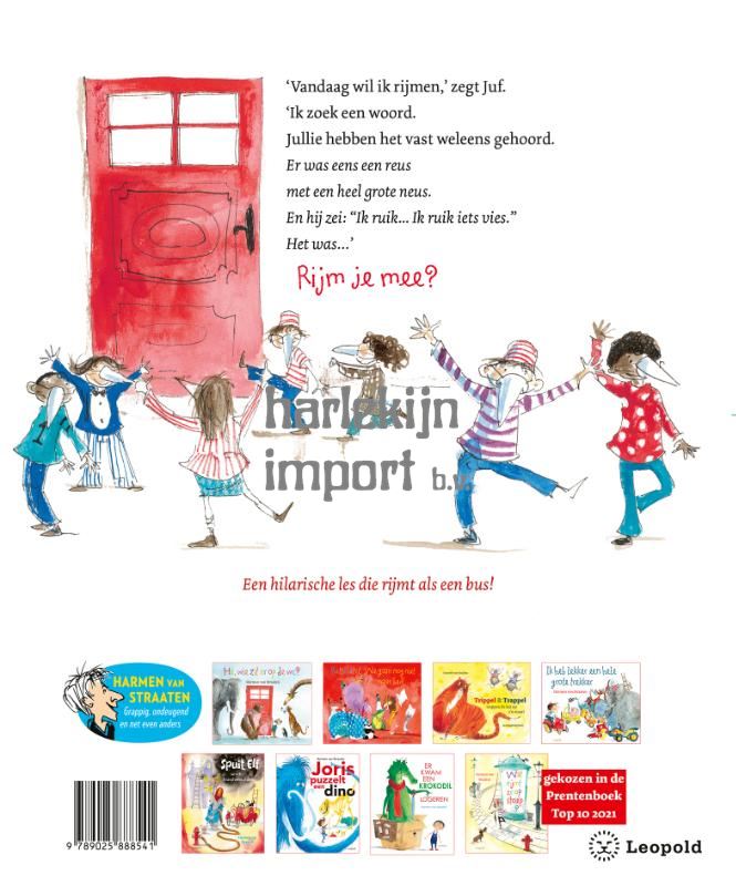 <p>‘Vandaag wil ik rijmen,’ zegt Juf.</p> <p>‘Ik zoek een woord.</p> <p>Jullie hebben het vast weleens gehoord.</p> <p><i>Er was eens een reus</i></p> <p><i>met een heel grote neus.</i></p> <p><i>En hij zei: “Ik ruik... Ik ruik iets vies.” </i></p> <p><i>Het was…’</i></p> <p>Rijm je mee?</p> <p> </p> <p>De kinderen van de klas rijmen er meteen vrolijk op los. Juf heeft een woord in haar hoofd, maar dat geven de kinderen haar niet. Ze bedenken heel knap de gekste dingen die vies zijn. Totdat het schoolhoofd meneer De Reus op het kabaal afkomt...</p> <p><i>Een hilarische les die rijmt als een bus! </i></p> <p><i>Geweldig geïllustreerd door Harmen van Straaten, grappig, ondeugend en net even anders.</i></p>