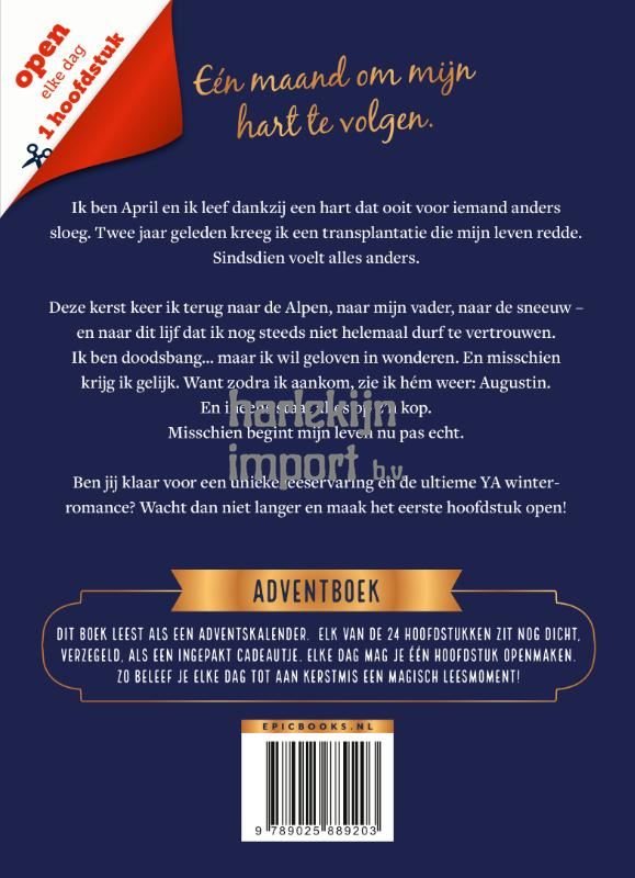 Unbox dit boek! A Heart for Christmas van Sophie Jomain is een adventboek: het leest als een adventskalender. Elk van de 24 hoofdstukken zit nog dicht, verzegeld, als een ingepakt cadeautje. Elke dag mag je één hoofdstuk openmaken. Zo beleef je elke dag tot aan Kerstmis een magisch leesmoment! April leeft dankzij een hart dat ooit voor iemand anders sloeg. Twee jaar geleden kreeg ze een transplantatie die haar leven redde. Sindsdien voelt alles anders. Deze kerst keert ze terug naar de Alpen, naar haar vader, naar de sneeuw – en naar haar lijf, dat ze nog steeds niet helemaal durft te vertrouwen. Ze is doodsbang… maar ze wil geloven in wonderen. En misschien krijgt ze gelijk. Want zodra ze aankomt, ziet ze hém weer: Augustus. En ineens staat alles op z’n kop. Misschien begint haar leven nu pas echt. Ben jij klaar voor een unieke leeservaring en de ultieme YA winterromance? Wacht dan niet langer en maak het eerste hoofdstuk open!