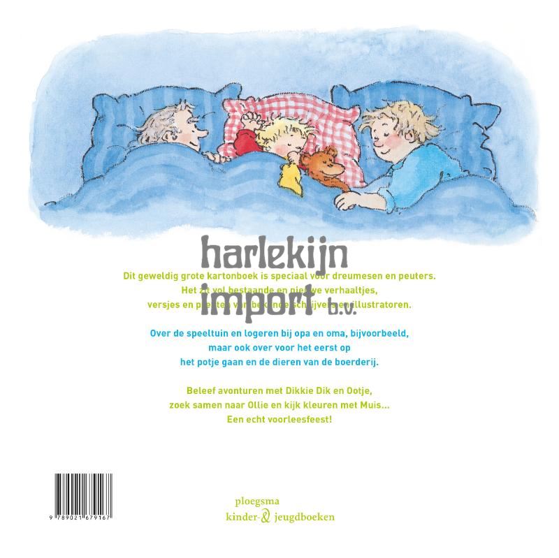 Dit geweldig grote kartonboek is speciaal voor dreumesen en peuters. Het zit vol bestaande en nieuwe verhaaltjes, versjes en prenten van bekende schrijvers en illustratoren. Over de speeltuin en logeren bij opa en oma, bijvoorbeeld, maar ook over voor het eerst op het potje gaan en de dieren van de boerderij. Beleef avonturen met Dikkie Dik en Ootje, zoek samen naar Ollie en kijk kleuren met Muis... Een echt voorleesfeest!