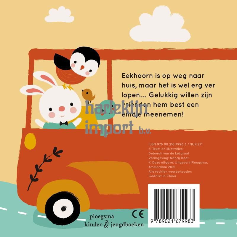 Eekhoorn is op weg naar huis, maar het is wel erg ver lopen... Gelukkig willen een bus, een tractor, een auto en de brandweer hem wel een eindje meenemen!