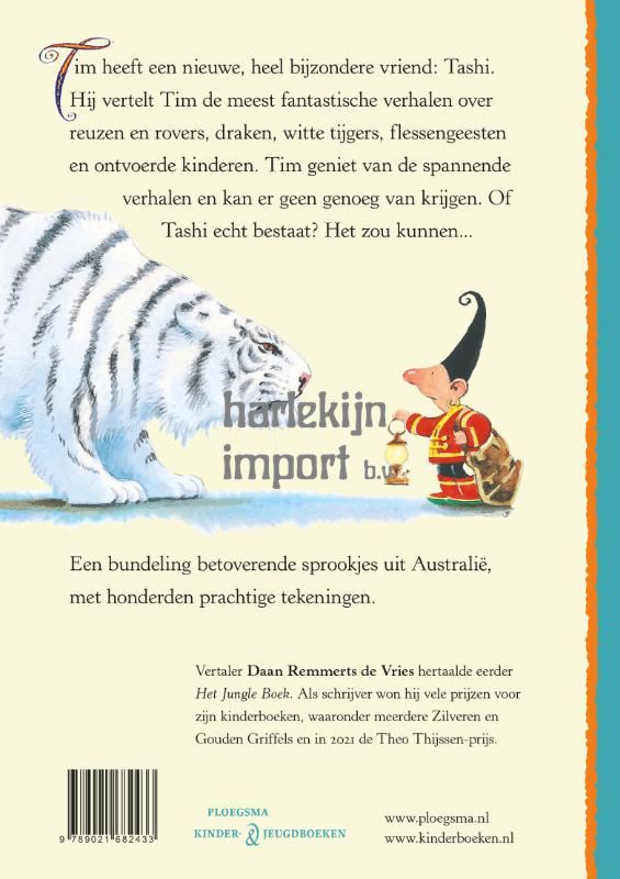 Tashi vertelt Tim de meest fantastische verhalen over reuzen en rovers, draken en dieven, over witte tijgers, flessengeesten en ontvoerde kinderen. Tim vindt het spannend en kan er geen genoeg van krijgen. Ook Tims vader en moeder luisteren graag mee.
