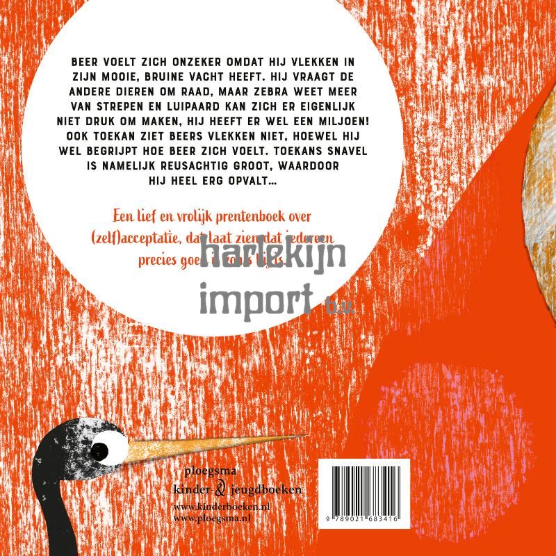 Beer voelt zich onzeker omdat hij vlekken in zijn mooie, bruine vacht heeft. Hij vraagt de andere dieren om raad, maar Zebra weet meer van strepen en Luipaard kan zich er eigenlijk niet druk om maken, hij heeft er wel een miljoen! Ook Toekan ziet Beers vlekken niet, hoewel hij wel begrijpt hoe Beer zich voelt. Toekans snavel is namelijk reusachtig groot, waardoor hij heel erg opvaltā¦