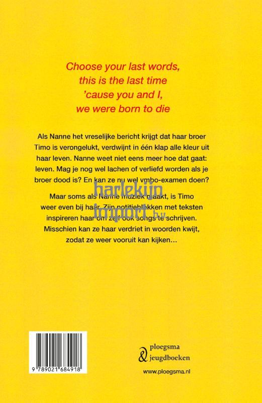 'Woorden van Timo' van Tialda Hoogeveen vertelt het verhaal van Nanne. Wanneer haar broer wordt aangereden door een vrachtwagen en overlijdt, staat haar leven op z’n kop. Precies in het jaar dat ze vmbo-examen moet doen en een opleiding moet kiezen, terwijl ze geen idee heeft wat ze wil worden. En dan is ze ook nog eens voor het eerst in haar leven verliefd, natuurlijk op een onbereikbare jongen. Gelukkig heeft Nanne al Timo’s notitieblokken nog, vol met verhalen, gedichten en dagboekaantekeningen. Een aangrijpend boek over rouw en vriendschap, op de tonen van muziek en songteksten.
