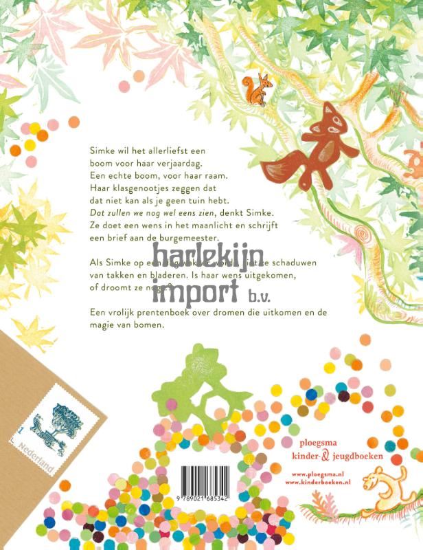 Simke is bijna jarig en ze heeft maar één grote wens: een boom in de straat. Ze schrijft een brief aan de burgemeester en wacht af. Als ze een paar dagen later wakker wordt, staat de straat vol bomen. Wat een geweldig cadeau! De hele straat komt tot leven: de boswachter vertelt over de dieren in de bomen, papa leest voor vanaf het balkon, er worden boomhutten gebouwd en kinderen spelen verstoppertje. Simke zou willen dat het bos voor altijd in hun straat blijft, maar kan dat wel?Linda de Haan werd voor het maken van dit fantasievolle prentenboek geïnspireerd door het BOSK-project in Leeuwarden, waar honderd dagen lang een bos door de straten trok. Ze zag hoe kinderen van de bomen genoten en speelden in dit wandelende bos.