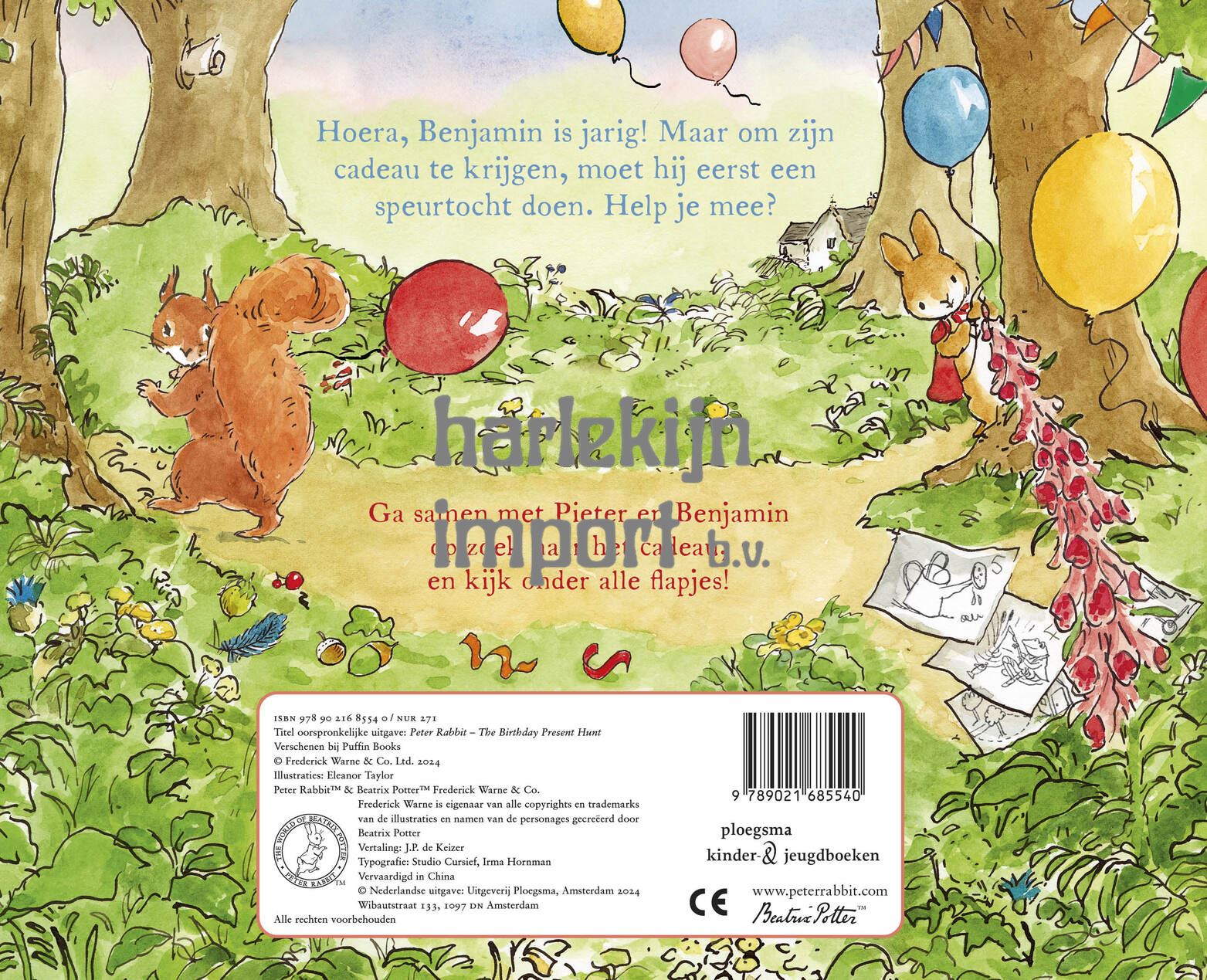 Benjamin Wollepluis is jarig en hij krijgt van al zijn vriendjes een cadeau. Maar eerst moet hij zelf op zoek! Langs alle dieren in het dorp en door de tuin van meneer Verhoef speurt hij met Pieter Konijn naar aanwijzingen. Een kruiwagen, een feesthoedje, een gieter… De tocht brengt hen naar een geweldige verrassing. Het wordt de leukste verjaardag ooit!'Pieter Konijn - De leukste verjaardag ooit!' van Beatrix Potter is een avontuurlijk en feestelijk verhaal met flapjes waarachter je steeds nieuwe dingen kunt ontdekken en mee kunt speuren naar aanwijzingen.