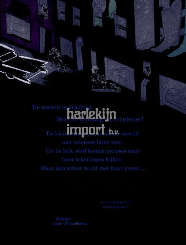 Het hoofd van de kleine kunstenaar zit vol met kleuren en dromen. Ze wil haar kunst aan de hele wereld laten zien, en reist naar een grote stad. Daar is alle ruimte om te tekenen, en ze maakt prachtige tekeningen op elk gebouw. Mensen komen van overal om ernaar te kijken, maar dan schiet ze uit met haar kwast… Dit verhaal van Ed Vere viert hoe mooi de wereld is en hoe fijn het is dat er kunstenaars zijn die dit laten zien. Het moedigt kinderen aan om zelf vrolijk te gaan tekenen en kleuren, zonder regels. Elk kind kan creatief zijn!