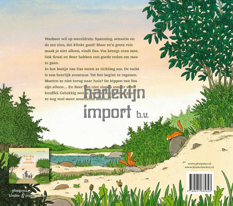 De zee oversteken, avontuur, spanning en sensatie: Wasbeer wil het allemaal! Daarom gaat hij op wereldreis, en al zijn vrienden willen mee. Das regelt de boot, Vos zorgt voor proviand, Beer wil graag vissen en Kraai vliegt voorop. Hun reis voert over kabbelende riviertjes, door stroomversnellingen en langs waterslangen. Maar hoe moet het eigenlijk verder met de kippen die Vos thuis heeft gelaten, of met het boek dat Wasbeer nog niet uit had? En met Beer, die helemaal niet kan slapen zonder zijn knuffel? In dit grappige en lieve prentenboek over vriendschap en avontuur nemen vijf vriendjes je mee op reis en laten ze zien dat het thuis eigenlijk ook best fijn kan zijn.