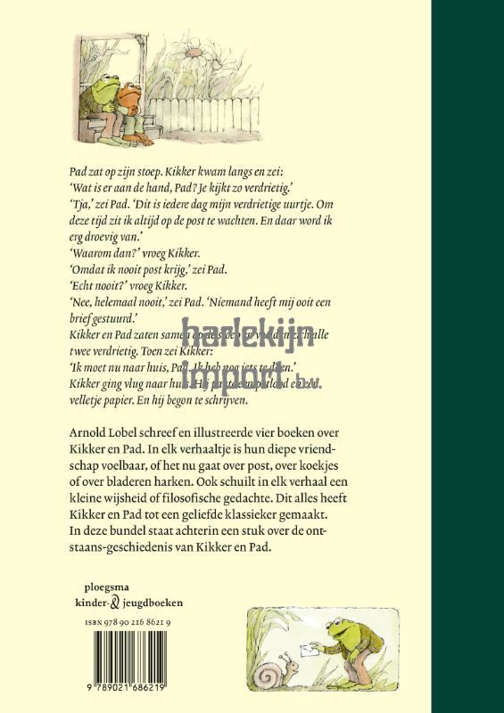 'Pad, Pad,' riep Kikker, 'wakker worden. Het is lente!' 'Buh,' zei een stem ergens in het huis. 'Pad, Pad!' riep Kikker weer. 'De zon schijnt! De sneeuw is aan het smelten. Wakker worden!' 'Ik ben er niet,' zei de stem. Ook al staat Kikker altijd te trappelen om iets te ondernemen en doet Pad het liever wat rustiger aan, toch zijn ze de beste vrienden die je je kunt voorstellen. In dit boek zijn al hun avonturen verzameld en ingedeeld naar de vier seizoenen. In de lente leest Pad zijn pas gezaaide zaadjes voor, omdat hij denkt dat ze misschien bang zijn in het donker. In de zomer proberen ze hun ijsjes op te eten vóór alles gesmolten is. In de herfst harken ze als verrassing de bladeren in elkaars tuin bij elkaar, zonder dat ze dat ooit van elkaar te weten komen. En in de winter zitten ze gezellig te griezelen bij de open haard. Maar... dan moet Pad natuurlijk wel eerst opstaan uit zijn winterslaap! Arnold Lobel kreeg twee Zilveren Griffels, een Zilveren Penseel en acht keer een Vlag en Wimpel.
