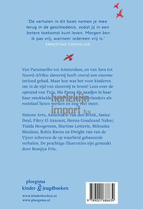 Morgen ben ik vrij bevat elf verhalen over de tijd van de slavernij, gezien door de ogen van kinderen. Van Paramaribo tot Amsterdam, en van Java tot CuraƧao: slavernij heeft overal een enorme invloed gehad. Dit jeugdboek met verhalende non-fictie brengen elf verhalen je dichter bij die geschiedenis. Elk verhaal wordt verteld door kinderen die destijds te maken hadden met slavernij. De opstand van Tula, het abolitionisme van Elizabeth Fry en Marten Douwes Teenstra, Ma Pansa die zaadjes in haar haar smokkelde: lees hun verhalen, en die van anderen. Maak kennis met de jonge Isack, die als pronkstuk cadeau wordt gegeven aan een adellijke familie. Of met Doni, die gevangenzit op een slavenschip en de schaduwjongen Untung, die op het familieportet van Pieter Cnoll staat in Batavia. De verhalen zijn spannend, ontroerend en hoopvol, en vertellen over moedige mensen die opstaan tegen onrecht. De verhalen in deze bundel zijn geschreven door bekende auteurs: Simone Arts, Annemarie van den Brink, Janice Deul, Fikry El Azzouzi, Henna Goudzand Nahar, Tialda Hoogeveen, Martine Letterie, Milouska Meulens, Robin Raven en Dwight van van de Vijver. Met een voorwoord van Ernestine Comvalius en prachtige, kleurrijke illustraties van Roeqiya Fris.