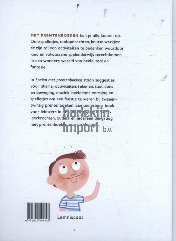 Met prentenboeken kun je alle kanten op. Dansspelletjes, taalopdrachten, knutselwerkjes: er zijn tal van activiteiten te bedenken waardoor kind én volwassene spelenderwijs terechtkomen in een wondere wereld van beeld, taal en fantasie. In "Spelen met prentenboeken" staan suggesties voor allerlei activiteiten: rekenen, taal, dans en beweging, muziek, beeldende vorming en spelletjes om een feestje te vieren bij tweeëntwintig prentenboeken. Een onmisbaar boek voor leidsters in de kinderopvang, kleuterleerkrachten, ouders en iedereen die graag met prentenboeken aan de slag wil.