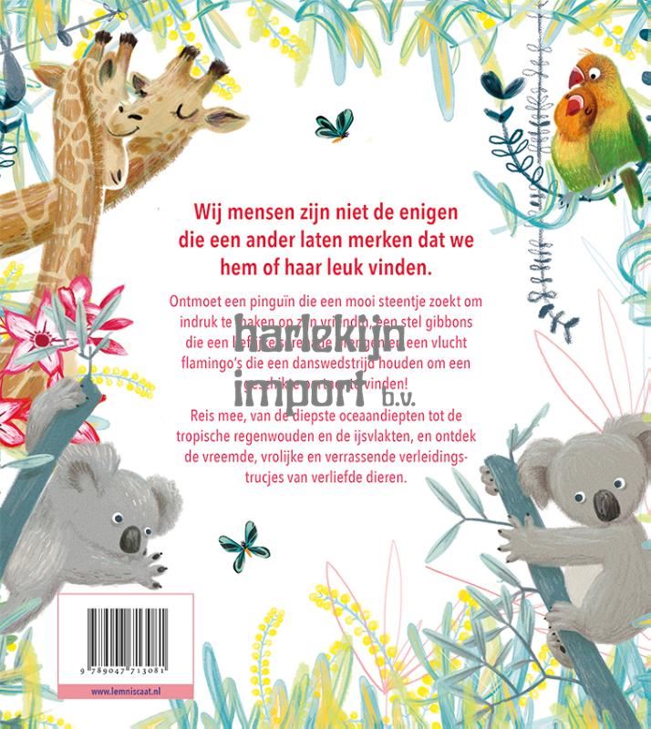 De mooiste manieren waarop dieren elkaar de liefde verklaren Mensen zijn niet de enigen die graag een romantisch aanzoek doen. Ontmoet een pinguïn die op jacht gaat naar de mooiste steen om indruk te maken op zijn vrouwtje. Kijk hoe een vlucht flamingo’s een meer verandert in een flitsende dansvloer waar naar hartenlust wordt geflirt. En luister hoe gibbons lieflijke serenades brengen. In dit boek zie je hoe dieren van de diepste diepzee tot in de tropische regenwouden elkaar de liefde verklaren. Dit prentenboek is het perfecte cadeau om je kind – of ieder ander – te zeggen hoeveel je van hem/haar/hen houdt.