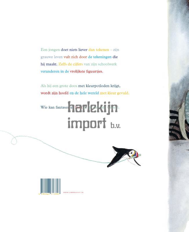 Een jongen doet niets liever dan tekenen – zijn grauwe leven vult zich met kleur door de tekeningen die hij maakt. Zelfs op school veranderen de cijfers van zijn rekenwerk in de vrolijkste figuurtjes. Als hij van een vriend een grote doos met kleurpotloden krijgt, wordt zijn fantasie helemaal ontketend: waar hij ook komt, op de fiets, op het strand, in het donkere bos, vult hij zijn hoofd en de wereld met kleur. Wie kan fantaseren leeft in de mooiste wereld. Marieke ten Berge heeft haar eigen fantasie ontketend in dit schitterende woordeloze prentenboek, dat een ode is aan kunst en verbeelding. Een verhaal, een droom – hoe je het ook bekijkt, een prentenboek waar je iedere keer weer gelukkig van wordt. Kunst brengt kleur in je leven!