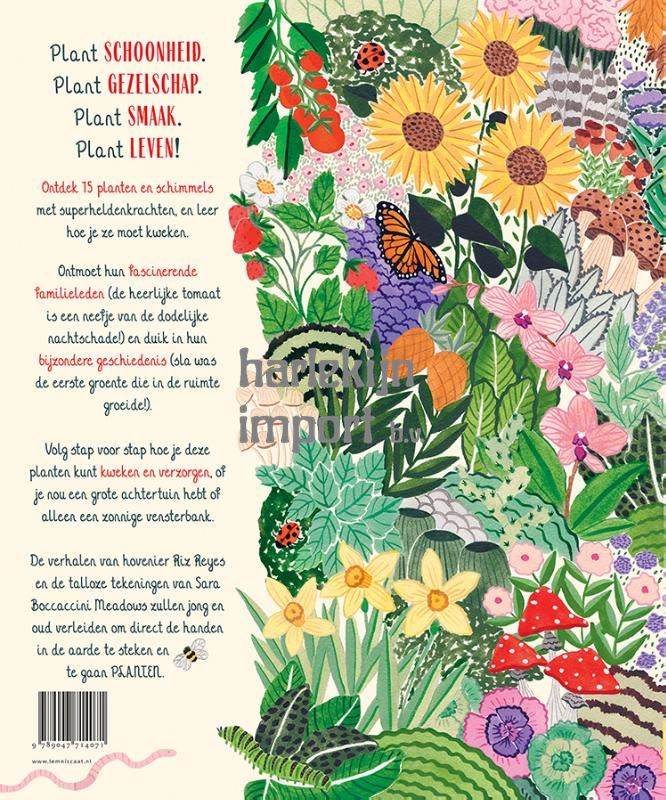 Het allermooiste plantenboek om meteen mee aan de slag te gaan Ontdek vijftien planten en schimmels met superheldenkrachten en leer hoe je ze moet kweken. Ontmoet hun fascinerende familieleden (de heerlijke tomaat is een neefje van de dodelijke nachtschade!) en duik in hun bijzondere geschiedenis (sla was de eerste groente die in de ruimte groeide). Volg stap voor stap hoe je deze planten kunt kweken en verzorgen, of je nou een grote achtertuin hebt of alleen een zonnige vensterbank. De verhalen van hovenier Riz Reyes en de talloze tekeningen van Sara Boccaccini Meadows zullen jong en oud verleiden om direct de handen in de aarde te steken en te gaan PLANTEN.