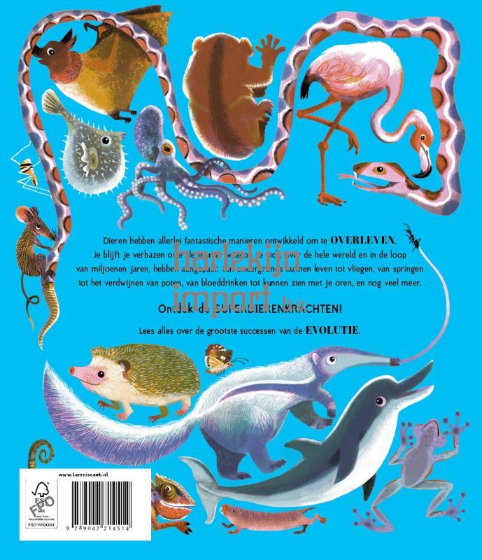 Ontdek de meest bijzondere superkrachten van dieren Een beschermend pantser, kunnen zien dankzij geluid, zweven zondervleugels – overal in het dierenrijk zie je dat dieren beschikken over de meest verbazingwekkende superkrachten om hun problemen in de natuur te tackelen. Deze superdierenkrachten zijn zelfs zo handig dat allerlei dieren die niets met elkaar te maken hebben dezelfde talenten hebben ontwikkeld! Maak kennis met de wezens die dezelfde ingenieuze trucjes hebben ontwikkeld om te overleven – van piepkleine insecten tot ellenlange giraffen. Ontdek de wonderen van de evolutie in dit door Viola Wang uitbundig geïllustreerde boek boordevol ongelooflijke feiten van zoöloog Dr. Nick Crumpton. Bloed drinken, ondergronds leven, snelzwemmen, slingeren aan grijpstaarten… Je blijft je verbazen over superdierenkrachten!