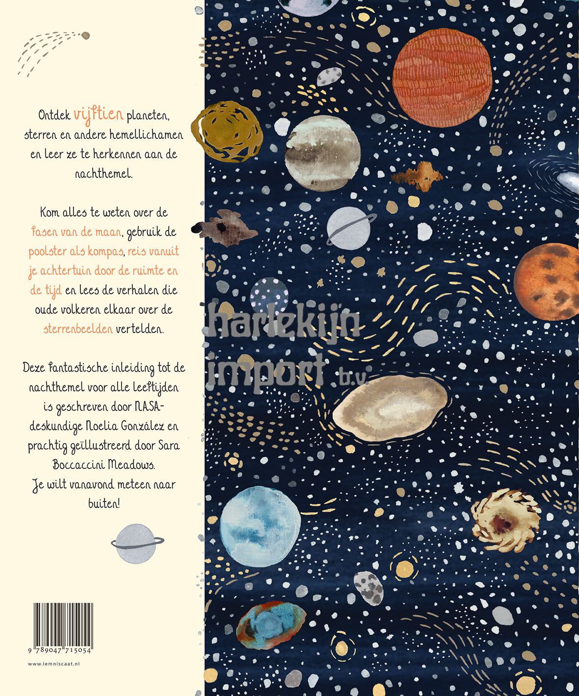 Alle hemelverschijnselen die in dit boek worden beschreven, zijn op een donkere nacht vanuit je achtertuin (of park, balkon of camping) te zien. Van de zon en de maan tot Venus en Mars, satellieten, de Grote Beer, de Melkweg en veel meer. Leer de maanfasen herkennen en je richting te bepalen aan de hand van de Poolster, en ontdek hoe je vanuit je slaapkamer door de ruimte en de tijd kunt reizen. Dit boek onthult hoe de mensheid is verweven met de sterrenbeelden die oplichten aan de hemel. De schrijfster werkt voor NASA, dus als iemand weet waar ze het over heeft, is zij het wel. Haar fijne uitleg en anekdotes zijn van prachtige, sfeervolle beelden voorzien door Sara Boccaccini Meadows, die eerder het schitterende Plant illustreerde.