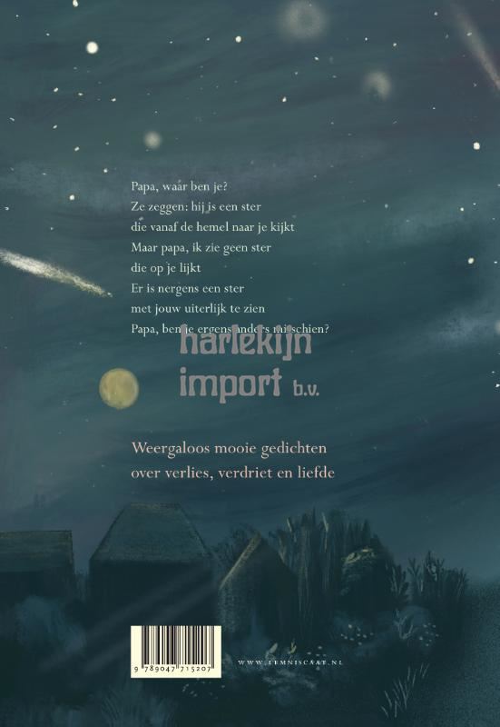 <p>Dit boek komt met een waarschuwing: het papier zal nat worden van de tranen. </p><p>Deze bundel bevat gedichten van Mireille Geus, geschreven vanuit een kind dat geconfronteerd wordt met het ergste dat hem of haar kan overkomen: de dood van een ouder. </p><p>In de loop van de gedichten komen alle gevoelens aan bod: het ongeloof, de wanhoop, de woede, het verscheurende gemis… maar uit alles spreekt dat wat achterblijft: de herinneringen en de liefde. </p><p>Een weergaloos mooi boek op indrukwekkende wijze geïllustreerd door Evy Van Guyse.</p>