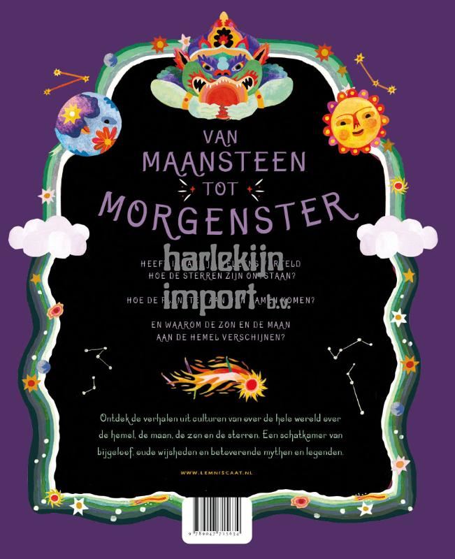 Wist je dat de godin Isis volgens de Griekse mythen de regenboog gebruikt als brug om berichten van de goden af te leveren aan de mensen? Dat het noorderlicht volgens volksverhalen uit Estland ontstaat als er magische paarden met hun wagens langs de sterren galopperen? Of dat je volgens de hindoeïstische mythologie in de toekomst kunt kijken als je een maansteen, gevormd door maanlicht, in je mond stopt? Ontdek in Van maansteen tot morgenster de verhalen uit culturen van over de hele wereld over de hemel, de maan, de zon en de sterren. Samen vormen ze een schatkamer van bijgeloof, oude wijsheden en betoverende mythen en legenden vol schitterende, op volkskunst geïnspireerde illustraties.