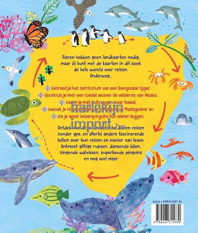 Dieren vinden hun weg zonder landkaarten, gps, kompas, straatnaamborden of andere dingen die wij nodig hebben om niet te verdwalen. Hoe weten ze hoe ze moeten reizen? Door gebruik te maken van de zon, de maan en de sterren, oceaanstromingen, het magnetisch veld van de aarde en hun zicht en reukvermogen…Jij kunt dat niet, maar dankzij de kaarten in dit boek reis je wel met tien verschillende diersoorten de hele wereld over.Onderweg betreed je het territorium van een Bengaalse tijger, doorkruis je met een roedel wolven de wildernis van Alaska, zwem je met bultruggen naar Hawaï, bezoek je ringstaartmaki’s in het bos op Madagaskar en zie je waar keizerspinguïns hun eieren leggen.Ontdek hoe deze fantastische dieren reizen zonder gps en allerlei andere fascinerende feiten over hun reizen en manier van leven. Ontmoet giftige rupsen, dansende bijen, zingende walvissen, superkoude pinguïns en nog veel meer…