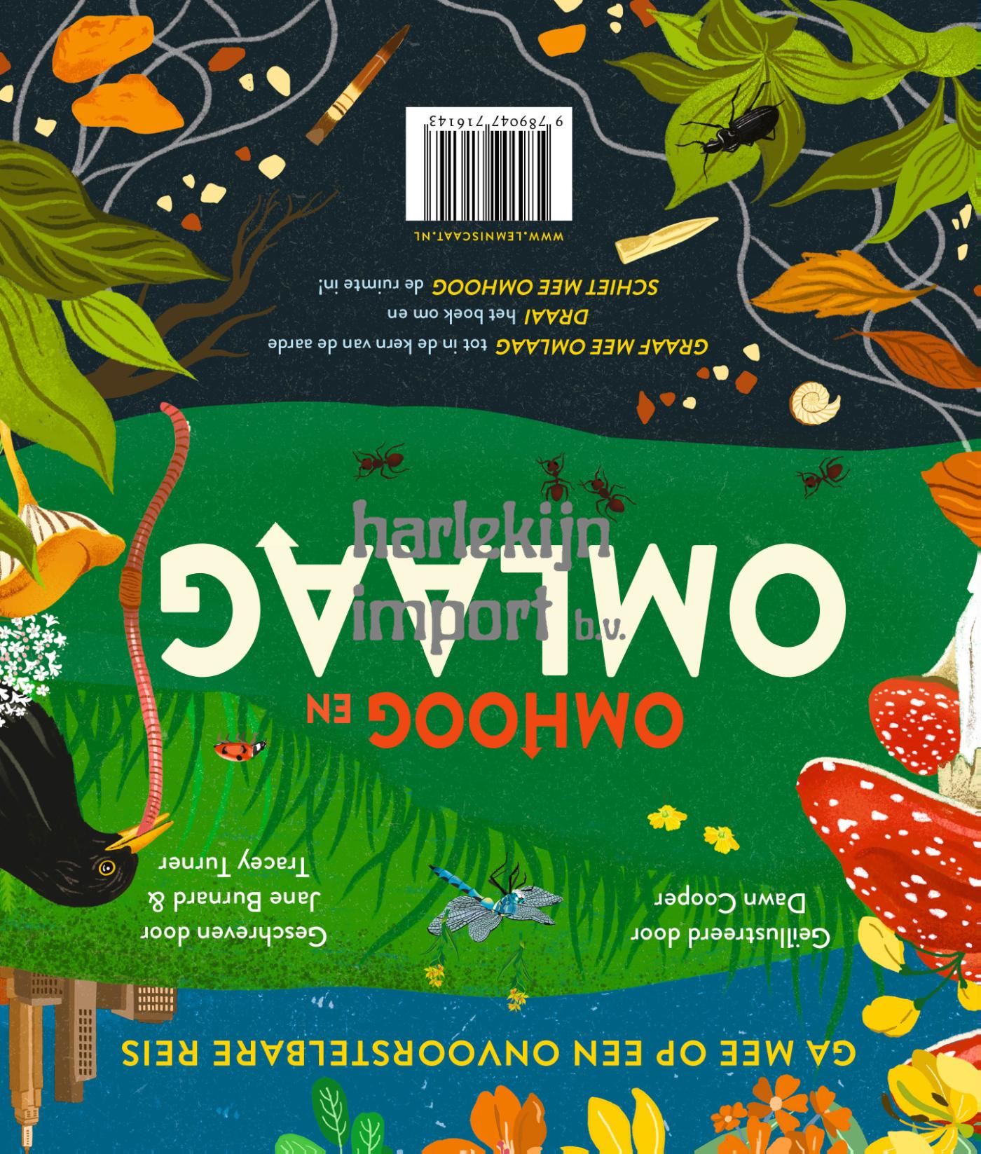 Reis mee naar bergtoppen, langs de wolken omhoog naar waar vliegtuigen vliegen, ontmoet vogels, insecten en fladderende vleermuizen. Vergeet je ruimtepak niet, want we zullen algauw de atmosfeer van de aarde verlaten, langs raketten en satellieten schieten en het zonnestelsel bezoeken. En dan gaan we nog hoger… en leer je ons sterrenstelsel kennen en neem je een kijkje in het heelal. En als je het heelal hebt verkend, draai je het boek gewoon om! Reis mee tot ver onder de straten van een stad en langs de ondergrondse woningen van diverse dieren. Ontdek diepe, donkere grotten, vurige vulkanen en (meer dan) kokendhete onderwaterbronnen en ontmoet gigantische kokerwormen en Yeti-krabben. Uiteindelijk komen we aan in de kern van de aardbol, waar het bijna net zo heet is als op het oppervlak van de zon, maar waar de sleutel tot alle leven op aarde te vinden is.