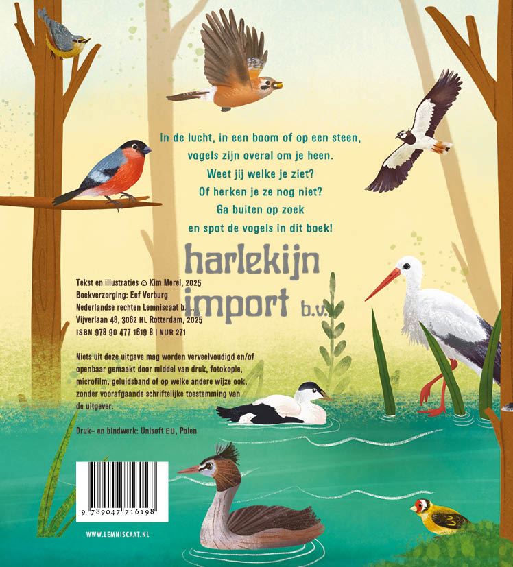 <p><em>In de lucht, in een boom of op een steen,<br />vogels zijn overal om je heen.<br />Herken de vogels in dit boek<br />en ga buiten naar ze op zoek!</em></p><p>De kleinste natuurliefhebbers kunnen hun hart ophalen met dit kartonboekje op rijm van bioloog en illustrator Kim Merel. Van de eend en de zwaan tot de boomklever en de strandloper: er zitten dertig vogels in dit boek!<br />Er zijn vogels die bij de sloot zitten, vogels om in het bos te leren kennen, vogels die aan het strand verblijven, vogels die rond de voedertafel in de tuin vliegen en vogels die je in de wei kunt zien. Een wandeling zal nooit meer hetzelfde zijn: wat is er veel te ontdekken en te benoemen!</p>