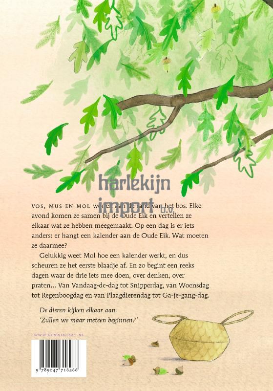 Vos, Mus en Mol wonen aan de rand van het bos. Elke avond ontmoeten ze elkaar bij de Oude Eik, dan eten ze samen en vertellen elkaar wat ze hebben meegemaakt.Op een dag is er iets anders: er hangt een kalender aan de Oude Eik. De dieren kijken elkaar aan.‘Wat moeten we daarmee?’ vraagt Mus.‘Een kalender weet wat voor een dag het is,’ zegt Mol. En zo begint een reeks dagen waar de drie over denken, iets mee doen, over peinzen, over praten… van Vandaag-de-dag tot Snipperdag, van Woensdag tot Regenboogdag en van Mantelzorgdag tot Ga-je-gang-dag. Iedere dag een prachtig verhaal. Gouden Griffel-winnares Annejan Mieras schreef verhalen die je keer op keer wilt lezen of horen. De tekeningen van Ruth Hengeveld zijn zo hartverwarmend dat je hoopt dat Mus, Mol en Vos bij jou in de tuin komen wonen.