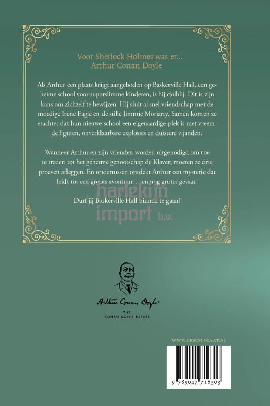 Als de jonge Arthur Conan Doyle een plaats krijgt aangeboden op Baskerville Hall, een geheime school voor buitengewoon begaafde kinderen, is hij dolblij. Dit is zijn kans om het tij te keren voor zijn familie. Hij sluit al snel vriendschap met de moedige Irene Eagle en de slimme Jimmie Moriarty. Samen komen ze erachter dat hun nieuwe school een eigenaardige plek is met scheve torens, onverklaarbare explosies en uitgestorven vogels. Arthur maakt al snel vijanden die willen dat hij van school wordt gestuurd… of erger.Wanneer Arthur en zijn vrienden worden uitgenodigd om toe te treden tot het geheime genootschap de Klaver, moeten ze drie proeven afleggen. En ondertussen ontdekt Arthur een mysterie dat leidt tot een groots avontuur… en nog groter gevaar. De echte Arthur Conan Doyle was de schrijver van de wereldberoemde en vaak verfilmde verhalen over Sherlock Holmes. Deze serie, die wordt verfilmd door de Oscarwinnende regisseur Ron Howard, zal lezers, jong en oud, net zo in hun greep houden.