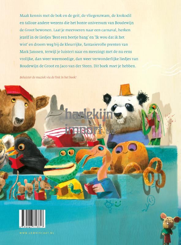 Het eerste liedjesprentenboek van het trio De Groot-Van der Steen-Janssen, Soms als ik een vlinder zie, sloeg in als een… vlinder: veelkleurig, verrassend, veelzijdig en vernieuwend. Zoals in de recensie op bazarow.nl stond: ‘een schatkist waar een gezin lang iets aan kan hebben (…) een gul boek dat met liefde en aandacht is gemaakt. Ik word er wel hebberig van. Het smaakt naar meer!’ En nu is er meer! Maak kennis met de bok en de geit, de vliegenzwam, de krokodil en talloze andere wezens die het bonte universum van Boudewijn de Groot bewonen. Laat je meevoeren naar een carnaval, herken je in de liedjes ‘Best een beetje bang’ en ‘Ik wou dat ik het wist’ en droom weg bij de kleurrijke, fantasievolle prenten van Mark Janssen terwijl je luistert naar en meezingt met de nu eens vrolijke, dan weer weemoedige, dan weer verwonderlijke liedjes van Boudewijn de Groot en Jaco van der Steen. Dit boek moet je hebben.