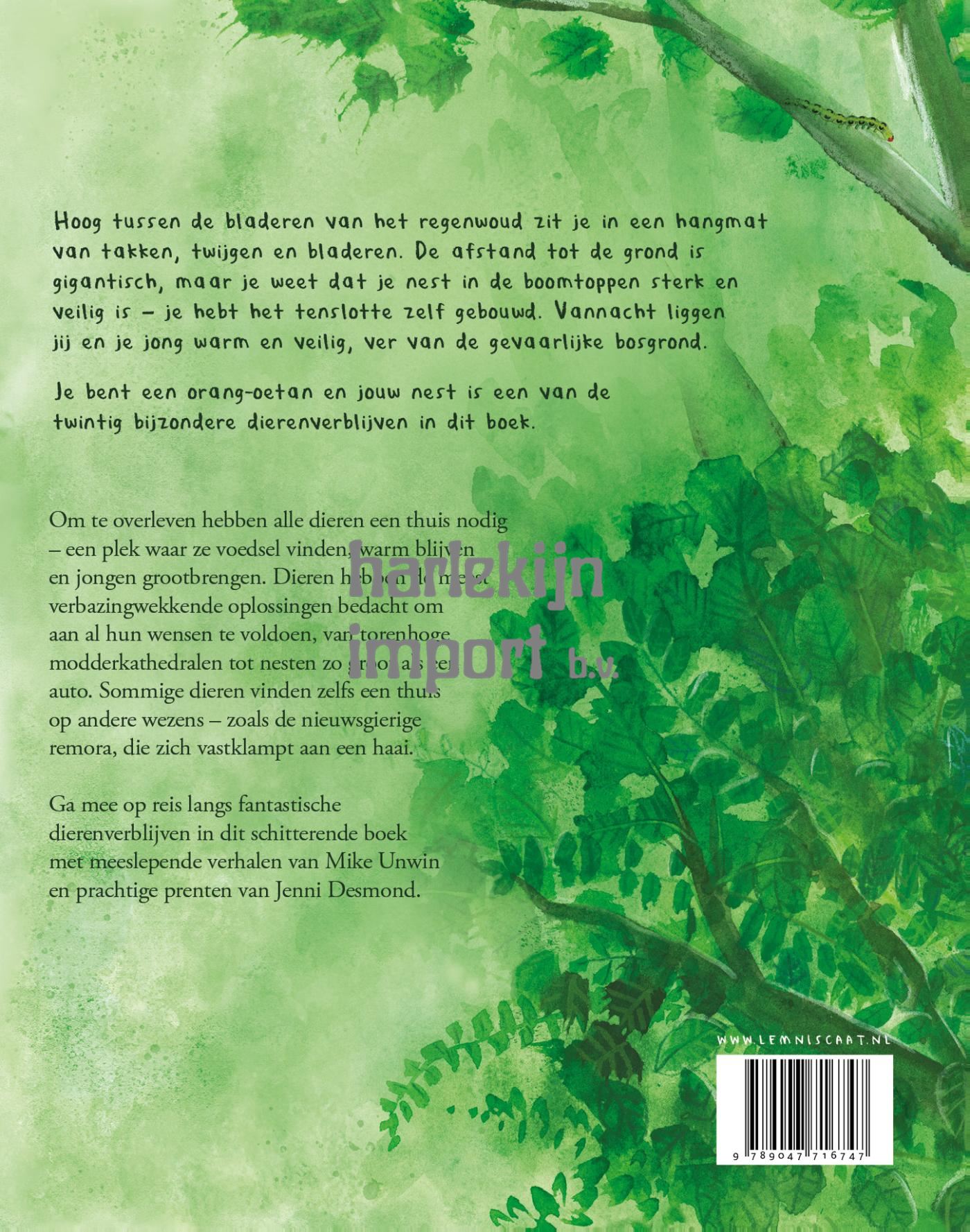 <p><em>Hoog tussen de bladeren van het regenwoud zit je in een hangmat van takken, twijgen en bladeren. De afstand tot de grond is gigantisch, maar je weet dat je nest in de boomtoppen sterk en veilig is – je hebt het tenslotte zelf gebouwd. Vannacht liggen jij en je jong warm en veilig, ver van de gevaarlijke bosgrond. <br />Je bent een orang-oetan en jouw nest is een van de twintig bijzondere dierenverblijven in dit boek.</em></p><p>Om te overleven hebben alle dieren een thuis nodig – een plek waar ze voedsel vinden, warm blijven en jongen grootbrengen. Dieren hebben de meest bijzondere bouwsels bedacht om aan al hun wensen te voldoen, van torenhoge modderkathedralen tot nesten zo groot als een auto. Sommige dieren vinden zelfs een thuis op andere wezens. <br />Ga mee op reis langs verrassende dierenverblijven in dit schitterende boek met meeslepende verhalen van Mike Unwin en prachtige prenten van Jenni Desmond.</p>