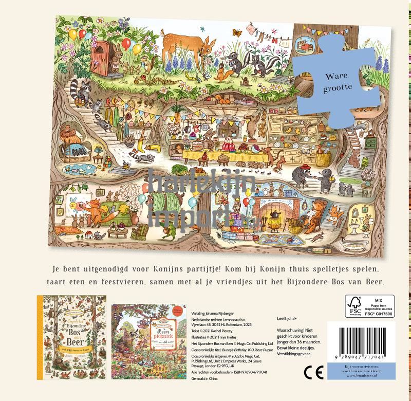 <p>In het Bijzondere Bos van Beer is het feest. Konijn is jarig en jij bent uitgenodigd op zijn partijtje. Hoe je er moet komen? Heel eenvoudig. Je hoeft alleen maar de juiste stukjes aan elkaar te leggen en dan verschijnt het feest vanzelf.</p><p>In de doos zit een poster die je kan helpen om de stukjes op de juiste plek te leggen. En kun je ook de twintig dingen vinden die zijn afgebeeld? <br />Puzzelen en zoeken… het is écht een feestje!</p>