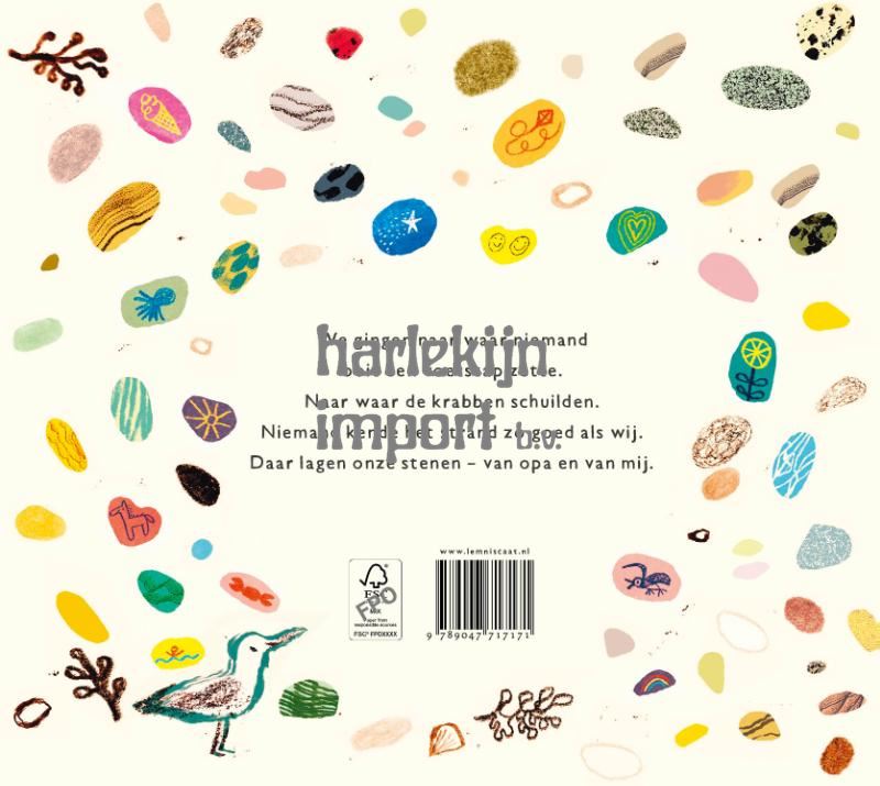 Opa wist altijd de beste weg naar het kiezelsteenstrand, door het wiebelbos, langs de treinen en de hondjes. En als ze het duin beklommen, roken ze de zee al. Op het strand ontmoetten ze een zeehond, vonden ze hout van een piratenschip en aten ze smeltende ijsjes… en elke keer voordat ze vertrokken, kozen ze allebei een kiezelsteentje om mee naar huis te nemen. Maar toen moest opa verhuizen. Een prachtig prentenboek over herinneringen en omgaan met verandering, van de maker van De jongen met bloemen in zijn haar en Dank je wel. In meeslepende taal en zachte, zonovergoten illustraties laat Jarvis zien dat herinneringen altijd voor het oprapen liggen, net als steentjes op een kiezelstrand.